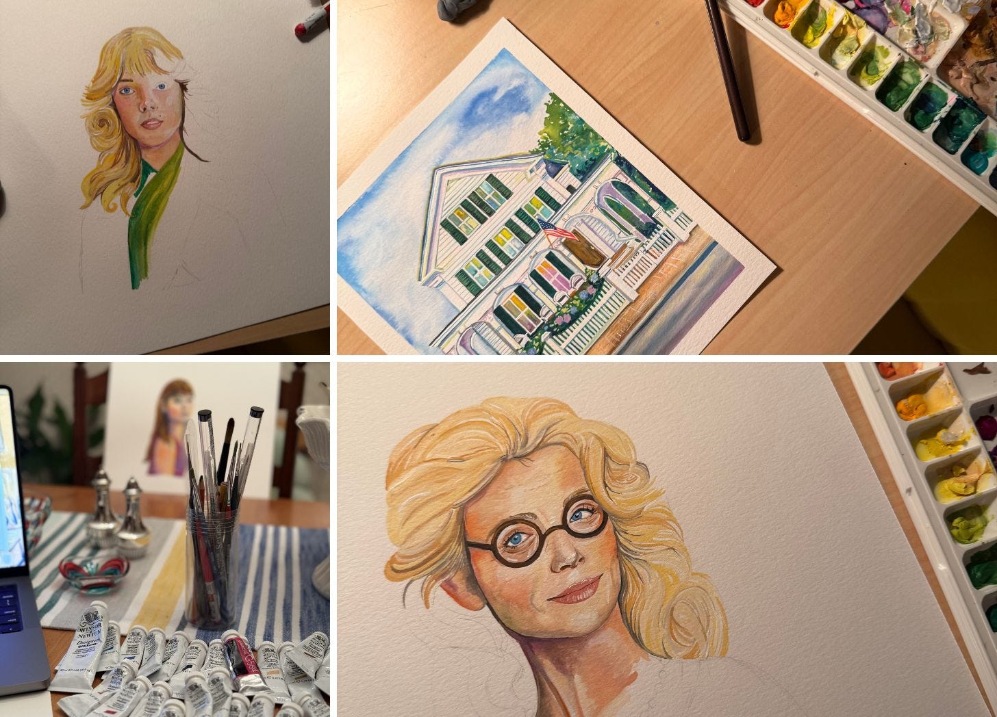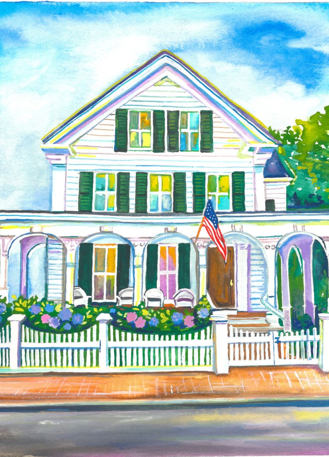 In addition to the portraits, the Whiting house is so central to the novel that I knew I had to tackle it. I wanted to imagine how it might have looked in its prime on a sunlit, blue-skied day of summer, hydrangeas bursting by the front gate. In my mind, the girls are waiting just out of view, ready to rush inside for their mom’s famous spaghetti and clams or maybe just to enjoy a slow evening on the porch.