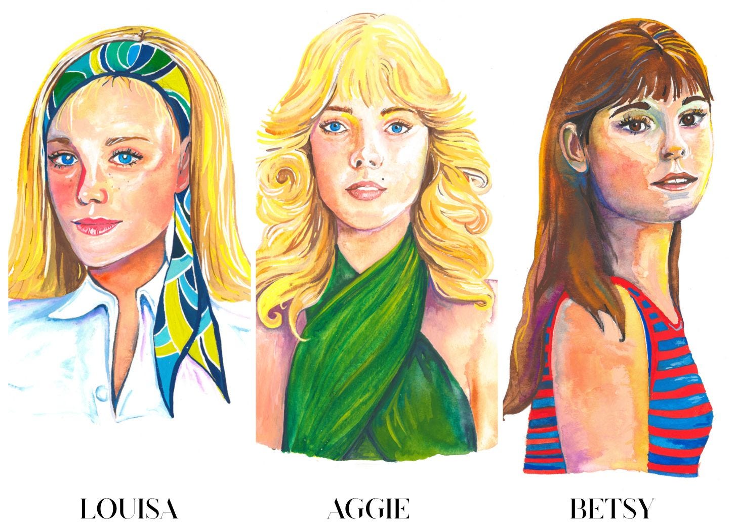 I spent a long time on this part—it was important to me that the women felt believably related, but also like unique individuals (especially since three of the four are blond and blue-eyed!) And of course, I wanted to infuse a bit of ‘70s flair into all of their looks, but still with a certain timelessness, since I think your writing so beautifully balances these near-historical settings with contemporary themes. The final portraits are a composite of many different inspirations, as well as a bit of my own interpretation.