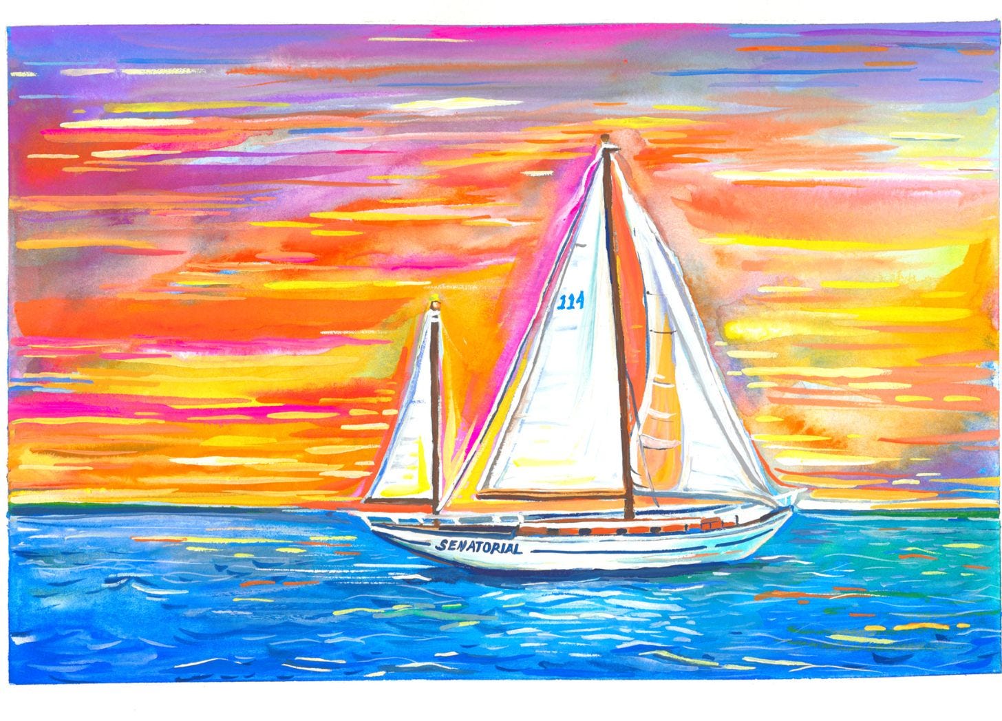 Senatorial, of course, is the sailboat on which Betsy grew up sailing with her father. I painted it at sunset because I wanted to capture it the way that Betsy experiences it—glowing with nostalgia and a sense of horizon-less possibility.